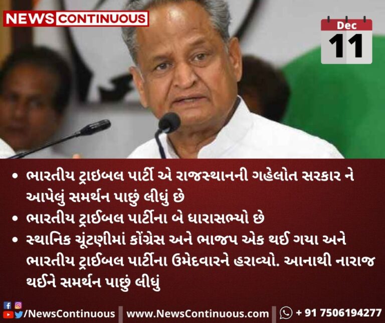 - ભારતીય ટ્રાઇબલ પાર્ટી એ રાજસ્થાનની ગહેલોત સરકાર ને આપેલું સમર્થન પાછું લીધું છે