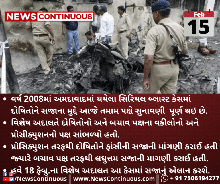 વર્ષ 2008માં અમદાવાદમાં થયેલા સિરિયલ બ્લાસ્ટ કેસમાં દોષિતોને સજાના મુદ્દે આજે તમામ પક્ષે સુનાવણી પૂર્ણ થઇ છે.