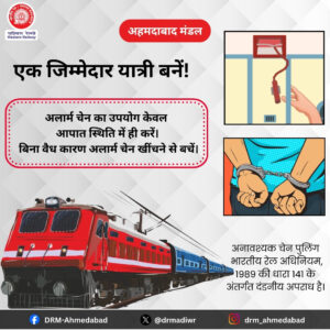 Ahmedabad Railway Division પશ્ચિમ રેલવેના અમદાવાદ મંડળમાં ડિસેમ્બર 2025 થી 19 ફેબ્રુઆરી 2026 દરમિયાન કુલ 484 એલાર્મ ચેન પુલિંગ (ACP) ની ઘટનાઓ નોંધાઈ હતી. તેમાંથી 449 કેસોમાં નિયમિત રીતે કેસ નોંધવામાં આવ્યા હતા, જ્યારે બાકીના કેસોમાં પ્રાથમિક તપાસ બાદ કાનૂની કારણોસર કેસ નોંધવામાં આવ્યા નહોતા.આ કેસોમાં કાર્યવાહી કરતાં રેલવે સુરક્ષા દળ (RPF) દ્વારા 408 વ્યક્તિઓની ધરપકડ કરવામાં આવી હતી તેમજ ₹48,700 નો દંડ વસૂલવામાં આવ્યો હતો.