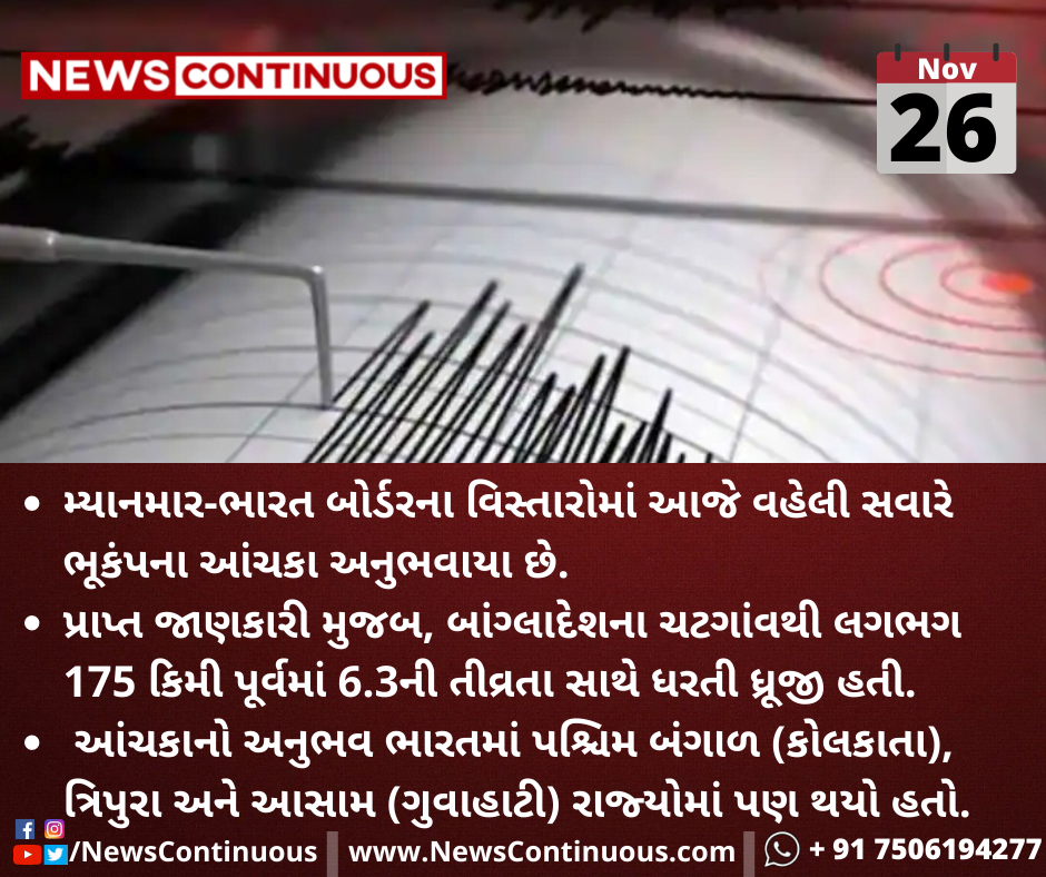 જાણકારી મુજબ, બાંગ્લાદેશના ચટગાંવથી લગભગ 175 કિમી પૂર્વમાં 6.3ની તીવ્રતા સાથે ધરતી ધ્રૂજી હતી.