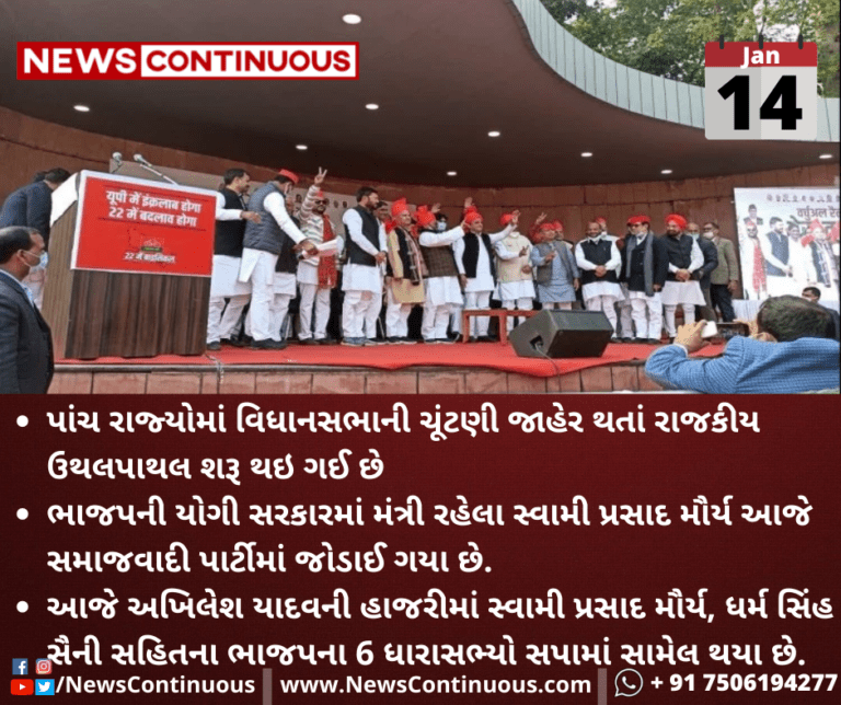આજે અખિલેશ યાદવની હાજરીમાં સ્વામી પ્રસાદ મૌર્ય, ધર્મ સિંહ સૈની સહિતના ભાજપના 6 ધારાસભ્યો સમાજવાદી પાર્ટીમાં સામેલ થયા છે.