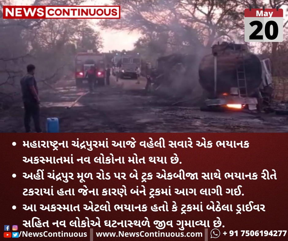 અહીં ચંદ્રપુર મૂળ રોડ(Mul highway) પર ટ્રક અને ડીઝલ ટેન્કર(diesel tanker) એકબીજા સાથે ભયાનક રીતે ટકરાયાં(Collision) હતા જેના કારણે બંને ટ્રકમાં આગ લાગી ગઈ.