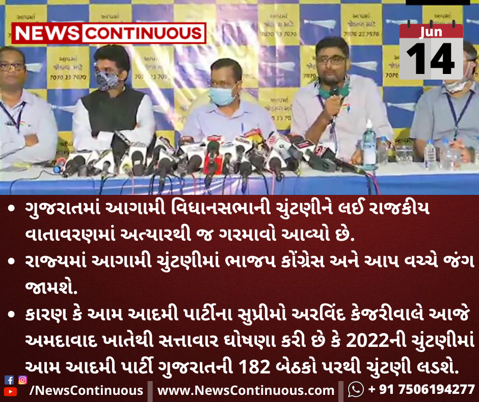 રાજ્યમાં આગામી ચુંટણીમાં ભાજપ કોંગ્રેસ અને આપ વચ્ચે જંગ જામશે. કારણ કે આમ આદમી પાર્ટીના સુપ્રીમો અરવિંદ કેજરીવાલે આજે અમદાવાદ ખાતેથી સત્તાવાર ઘોષણા કરી છે કે 2022ની ચુંટણીમાં આમ આદમી પાર્ટી ગુજરાતની 182 બેઠકો પરથી ચુંટણી લડશે.