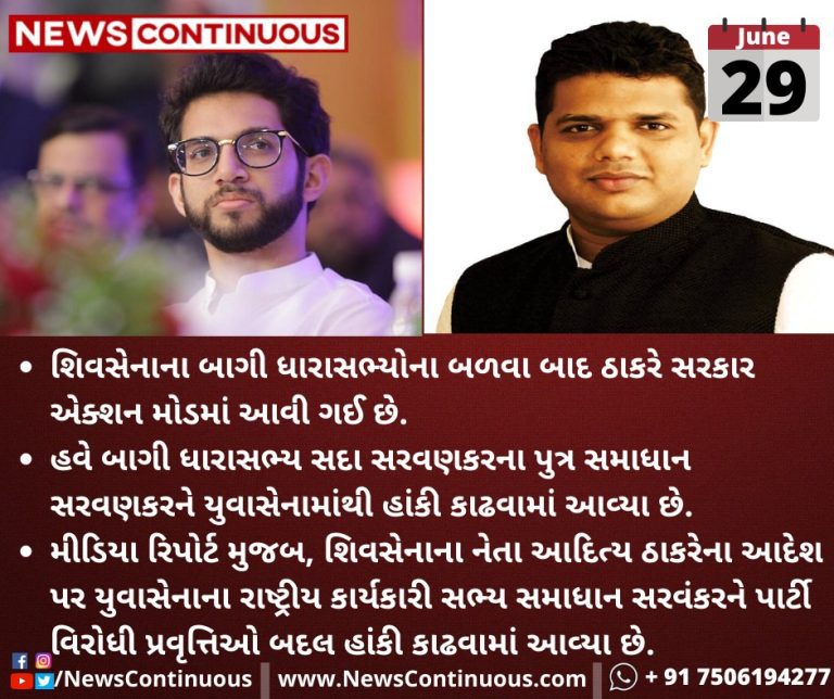 મીડિયા રિપોર્ટ મુજબ, શિવસેનાના નેતા આદિત્ય ઠાકરેના(Aaditya Thackeray) આદેશ પર યુવાસેનાના રાષ્ટ્રીય કાર્યકારી સભ્ય(National Executive Member) સમાધાન સરવંકરને પાર્ટી વિરોધી પ્રવૃત્તિઓ(Anti-party activity) બદલ હાંકી કાઢવામાં આવ્યા છે.