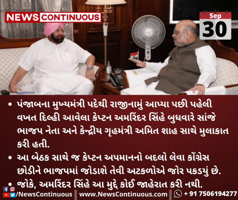 પંજાબના મુખ્યમંત્રી પદેથી રાજીનામું આપ્યા પછી પહેલી વખત દિલ્હી આવેલા કેપ્ટન અમરિંદર સિંહે બુધવારે સાંજે ભાજપ નેતા અને કેન્દ્રીય ગૃહમંત્રી અમિત શાહ સાથે મુલાકાત કરી હતી.
