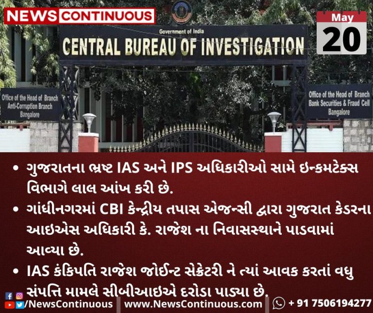 IAS કંકિપતિ રાજેશ જોઈન્ટ સેક્રેટરી ને(Joint Secretary) ત્યાં આવક કરતાં વધુ સંપત્તિ મામલે સીબીઆઇએ(CBI) દરોડા પાડ્યા છે.