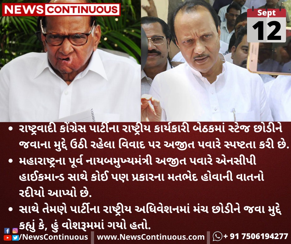 રાષ્ટ્રવાદી કોંગ્રેસ પાર્ટીના રાષ્ટ્રીય કાર્યકારી બેઠકમાં સ્ટેજ છોડીને જવાના મુદ્દે ઉઠી રહેલા વિવાદ પર અજીત પવારે સ્પષ્ટતા કરી છે.