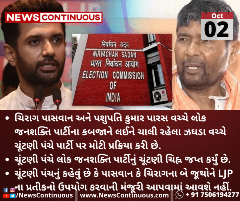 ચિરાગ પાસવાન અને પશુપતિ કુમાર પારસ વચ્ચે લોક જનશક્તિ પાર્ટીના કબજાને લઈને ચાલી રહેલા ઝઘડા વચ્ચે ચૂંટણી પંચે પાર્ટી પર મોટી પ્રક્રિયા કરી છે.