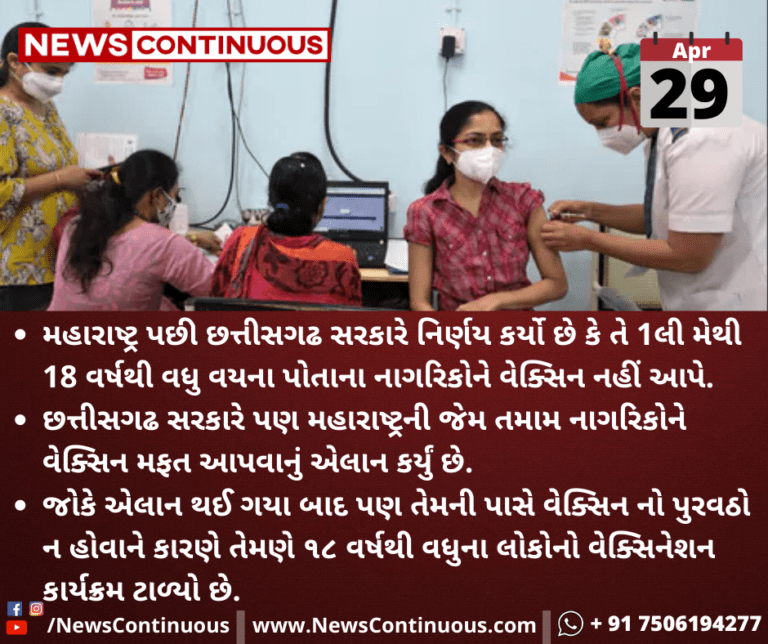 મહારાષ્ટ્ર પછી છત્તીસગઢ સરકારે નિર્ણય કર્યો છે કે તે પહેલી મેથી 18 વર્ષથી વધુ વયના પોતાના નાગરિકોને વેક્સિન નહીં આપે.