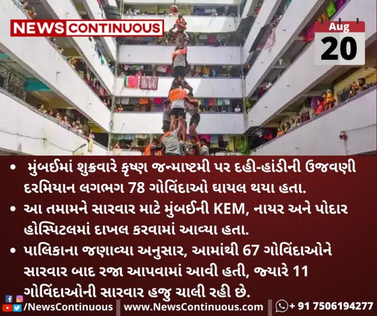 પાલિકાના(BMC) જણાવ્યા અનુસાર, આમાંથી 67 ગોવિંદાઓને સારવાર બાદ રજા આપવામાં આવી હતી, જ્યારે 11 ગોવિંદાઓની સારવાર હજુ ચાલી રહી છે.