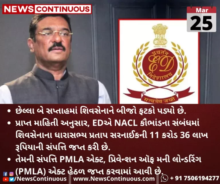 પ્રાપ્ત માહિતી અનુસાર, EDએ NACL કૌભાંડના સંબંધમાં શિવસેનાના ધારાસભ્ય પ્રતાપ સરનાઈકની 11 કરોડ 36 લાખ રૂપિયાની સંપત્તિ જપ્ત કરી છે.