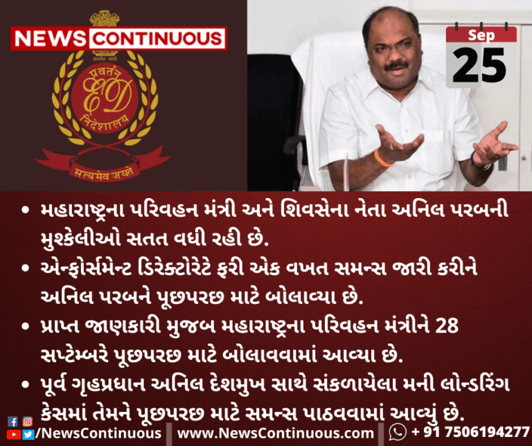 એન્ફોર્સમેન્ટ ડિરેક્ટોરેટે ફરી એક વખત સમન્સ જારી કરીને અનિલ પરબને પૂછપરછ માટે બોલાવ્યા છે.