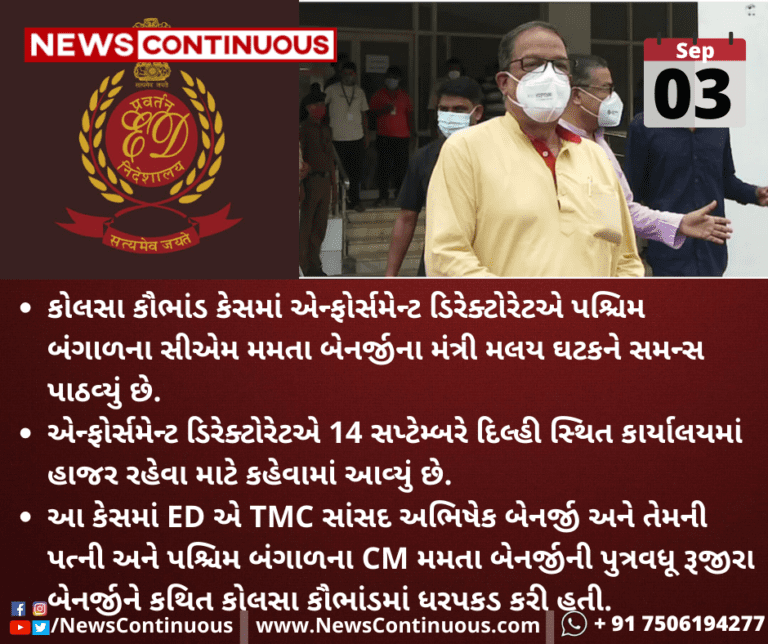 કોલસા કૌભાંડ કેસમાં એન્ફોર્સમેન્ટ ડિરેક્ટોરેટએ પશ્ચિમ બંગાળના સીએમ મમતા બેનર્જીના મંત્રી મલય ઘટકને સમન્સ પાઠવ્યું છે.