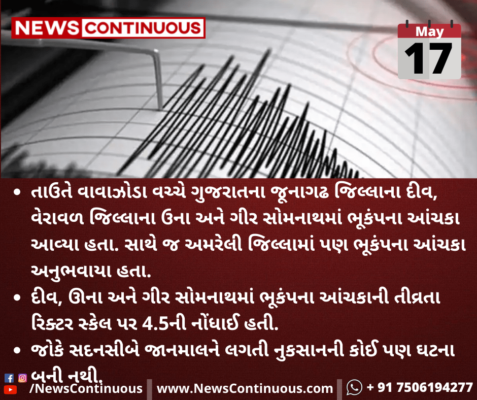 તાઉતે વાવાઝોડા વચ્ચે ગુજરાતના જૂનાગઢ જિલ્લાના દીવ, વેરાવળ જિલ્લાના ઉના અને ગીર સોમનાથમાં ભૂકંપના આંચકા આવ્યા હતા. સાથે જ અમરેલી જિલ્લામાં પણ ભૂકંપના આંચકા અનુભવાયા હતા.