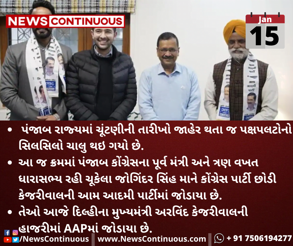 આ જ ક્રમમાં પંજાબ કોંગ્રેસના પૂર્વ મંત્રી અને ત્રણ વખત ધારાસભ્ય રહી ચૂકેલા જોગિંદર સિંહ માને કોંગ્રેસ પાર્ટી છોડી કેજરીવાલની આમ આદમી પાર્ટીમાં જોડાયા છે.