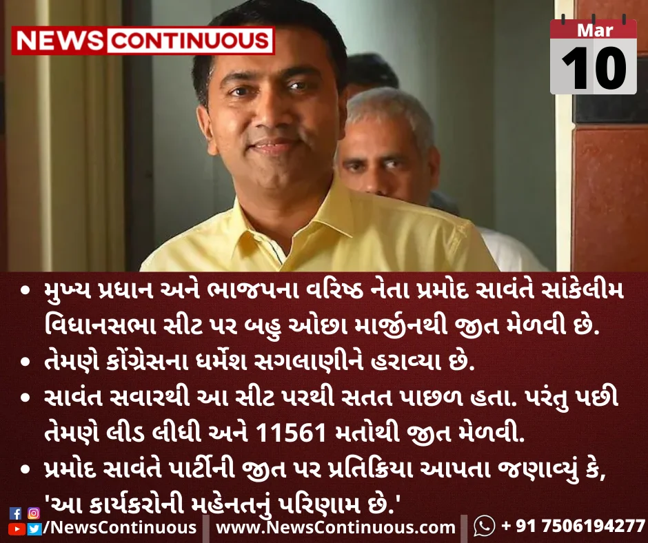 મુખ્ય પ્રધાન અને ભાજપના વરિષ્ઠ નેતા પ્રમોદ સાવંતે સાંકેલીમ વિધાનસભા સીટ પર બહુ ઓછા માર્જીનથી જીત મેળવી છે.