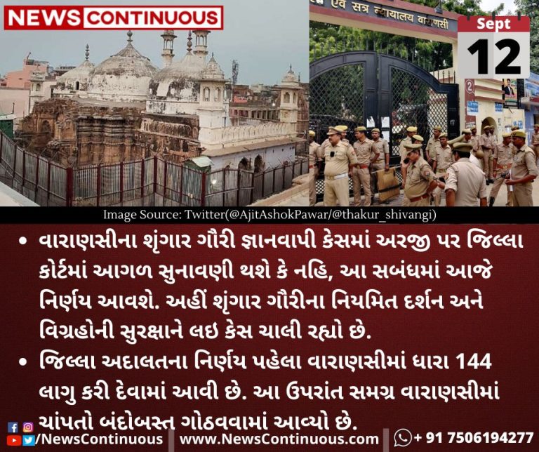 વારાણસી(Varanasi )ના શૃંગાર ગૌરી જ્ઞાનવાપી કેસ(Gyanvapi case) માં અરજી પર જિલ્લા કોર્ટ(District court)માં આગળ સુનાવણી થશે કે નહિ, આ સબંધમાં આજે 12 સપ્ટેમ્બરે નિર્ણય(Judgement) આવશે.