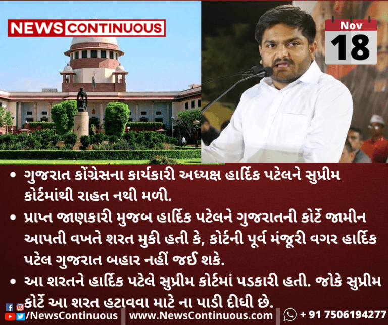 ગુજરાત કોંગ્રેસના કાર્યકારી અધ્યક્ષ હાર્દિક પટેલને સુપ્રીમ કોર્ટમાંથી રાહત નથી મળી.