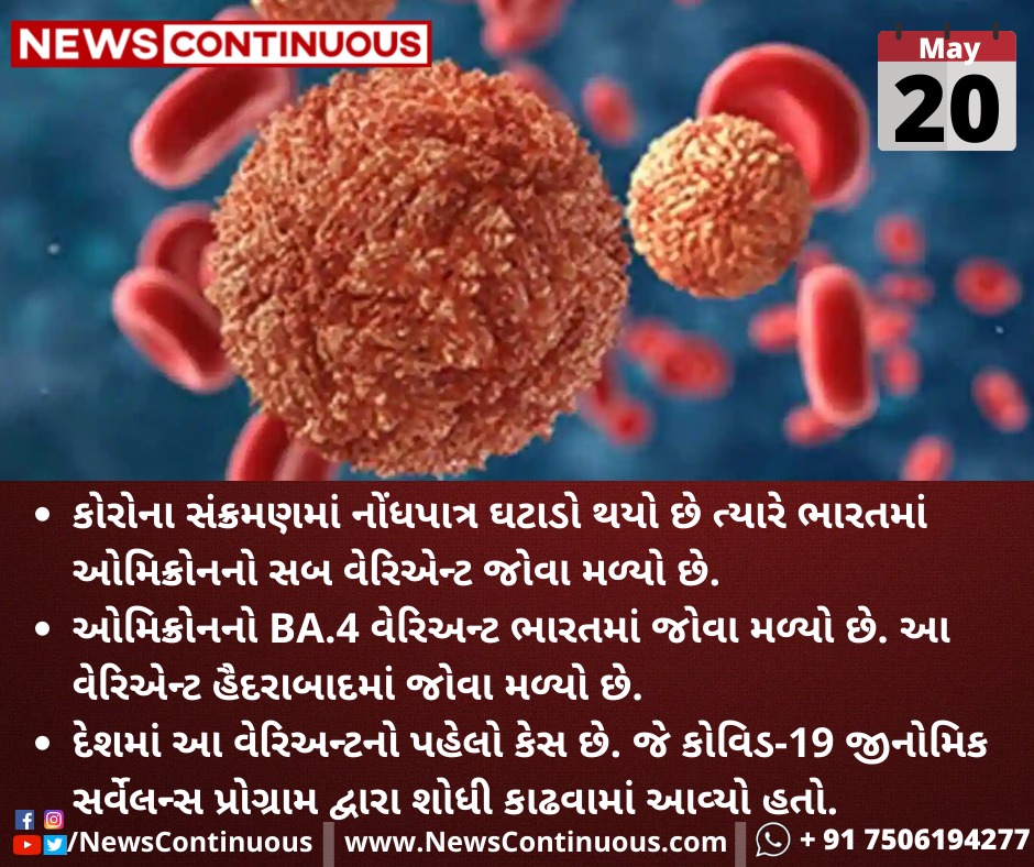 ઓમિક્રોનનો BA.4 વેરિઅન્ટ(BA.4 variant) ભારતમાં જોવા મળ્યો છે. આ વેરિએન્ટ હૈદરાબાદમાં(Hyderabad) જોવા મળ્યો છે.