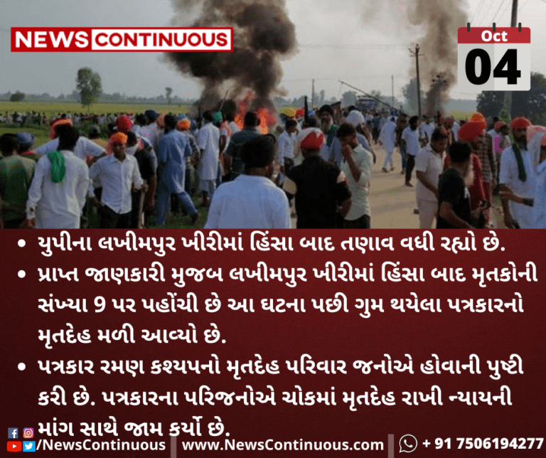 પ્રાપ્ત જાણકારી મુજબ લખીમપુર ખીરીમાં હિંસા બાદ મૃતકોની સંખ્યા 9 પર પહોંચી છે આ ઘટના પછી ગુમ થયેલા પત્રકારનો મૃતદેહ મળી આવ્યો છે.