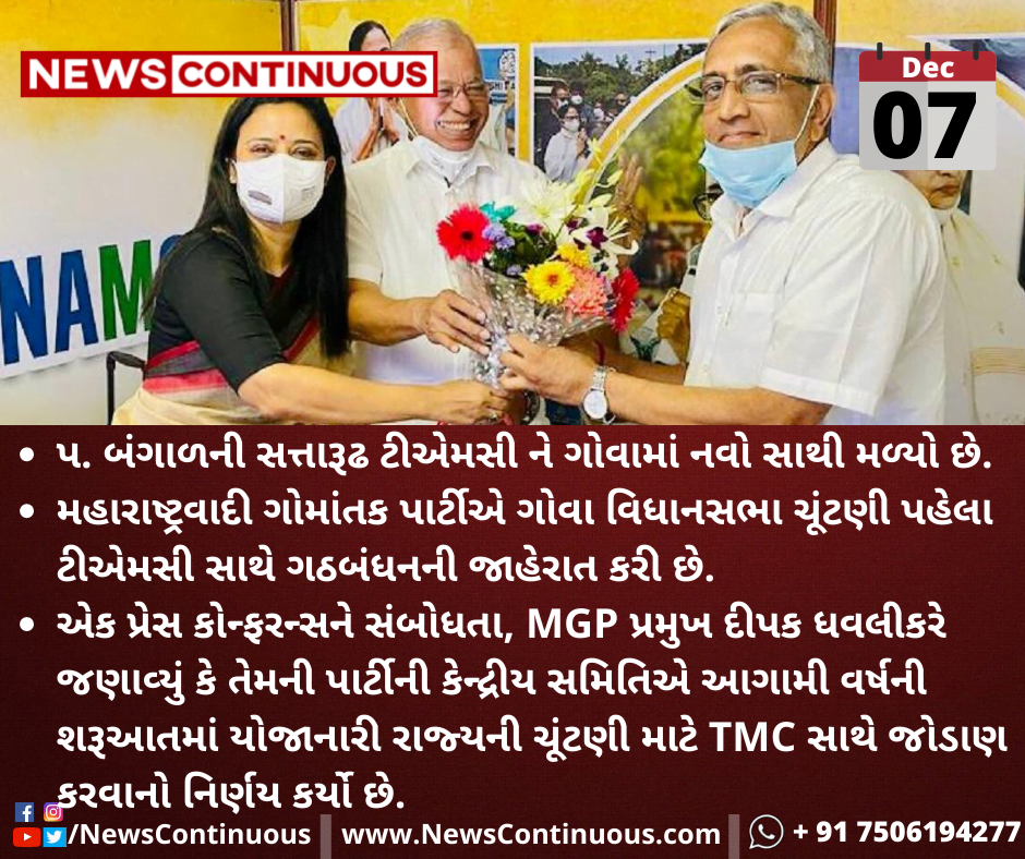 એક પ્રેસ કોન્ફરન્સને સંબોધતા, MGP પ્રમુખ દીપક ધવલીકરે જણાવ્યું કે તેમની પાર્ટીની કેન્દ્રીય સમિતિએ આગામી વર્ષની શરૂઆતમાં યોજાનારી રાજ્યની ચૂંટણી માટે TMC સાથે જોડાણ કરવાનો નિર્ણય કર્યો છે.