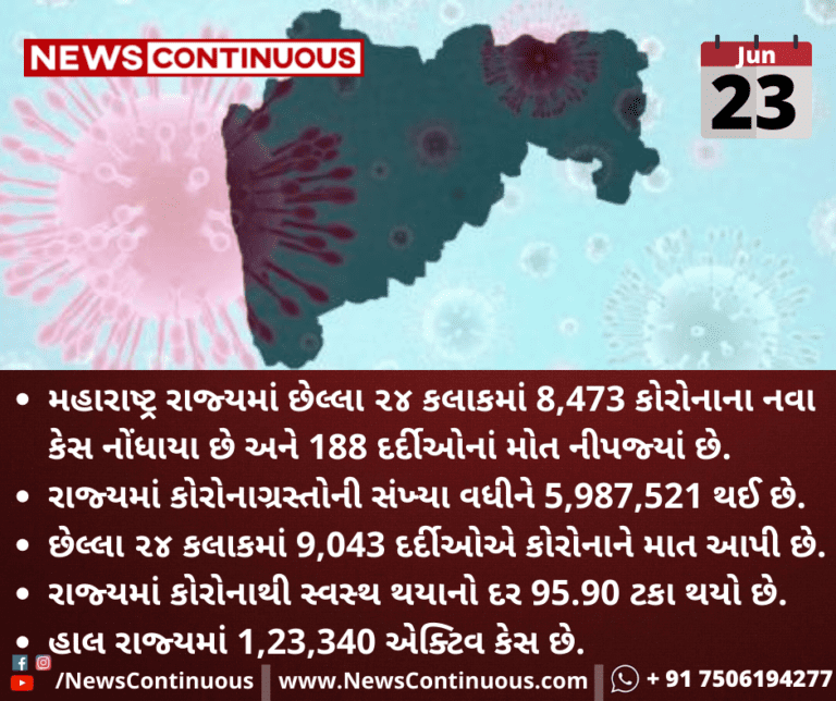 મહારાષ્ટ્ર રાજ્યમાં છેલ્લા ૨૪ કલાકમાં 8,473 કોરોનાના નવા કેસ નોંધાયા છે અને 188 દર્દીઓનાં મોત નીપજ્યાં છે.