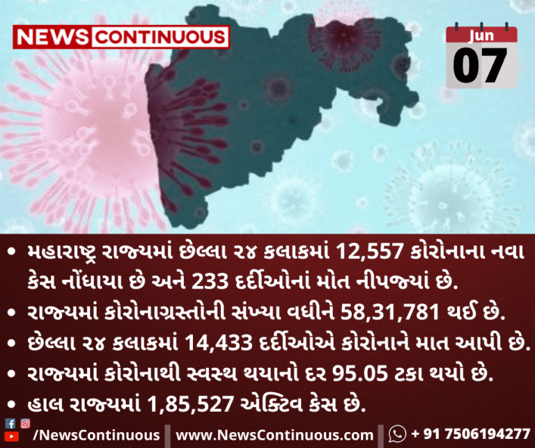 મહારાષ્ટ્ર રાજ્યમાં છેલ્લા ૨૪ કલાકમાં 12,557 કોરોનાના નવા કેસ નોંધાયા છે અને 233 દર્દીઓનાં મોત નીપજ્યાં છે.