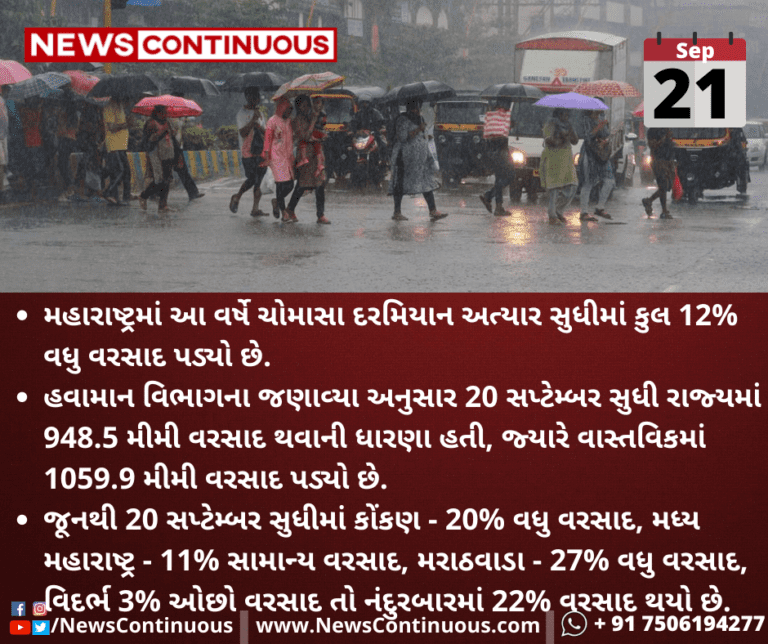 જૂનથી 20 સપ્ટેમ્બર સુધીમાં કોંકણ – 20% વધુ વરસાદ, મધ્ય મહારાષ્ટ્ર – 11% સામાન્ય વરસાદ, મરાઠવાડા – 27% વધુ વરસાદ, વિદર્ભ 3% ઓછો વરસાદ તો નંદુરબારમાં 22% વરસાદ થયો છે.