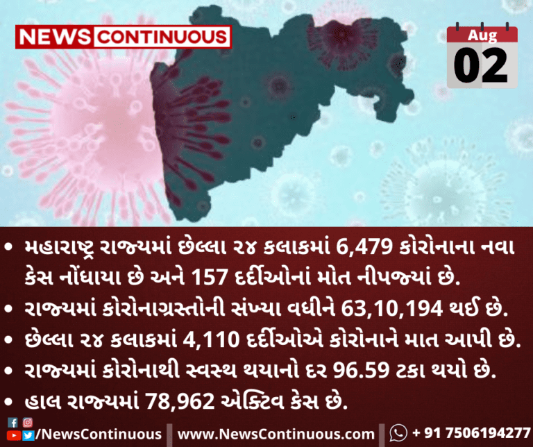 રાજ્યમાં કોરોનાગ્રસ્તોની સંખ્યા વધીને 63,10,194 થઈ છે.