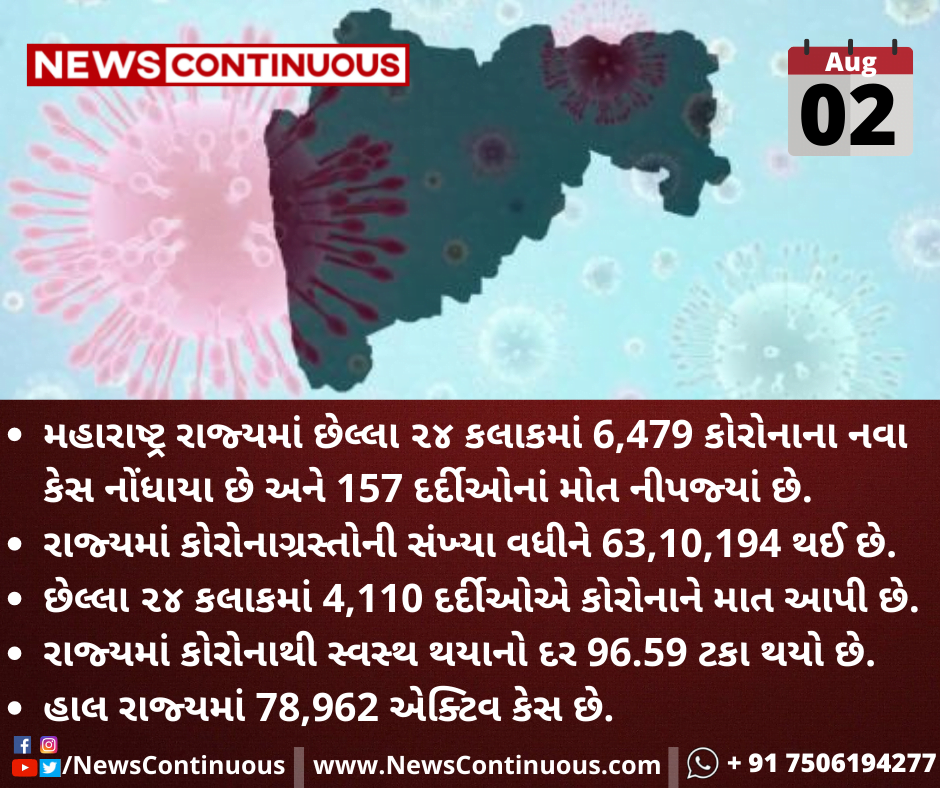 મહારાષ્ટ્ર રાજ્યમાં છેલ્લા ૨૪ કલાકમાં 6,479 કોરોનાના નવા કેસ નોંધાયા છે અને 157 દર્દીઓનાં મોત નીપજ્યાં છે.