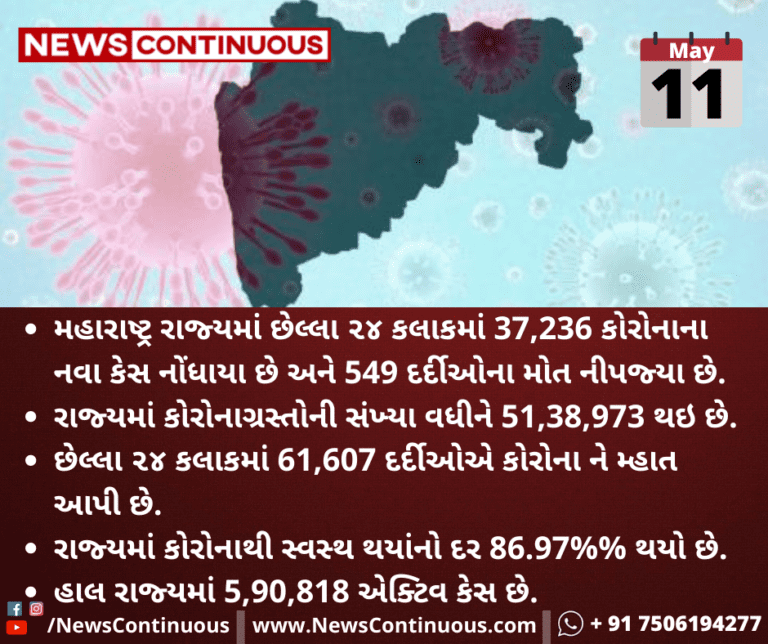 મહારાષ્ટ્ર રાજ્યમાં છેલ્લા ૨૪ કલાકમાં 37,236 કોરોનાના નવા કેસ નોંધાયા છે અને 549 દર્દીઓના મોત નીપજ્યા છે.