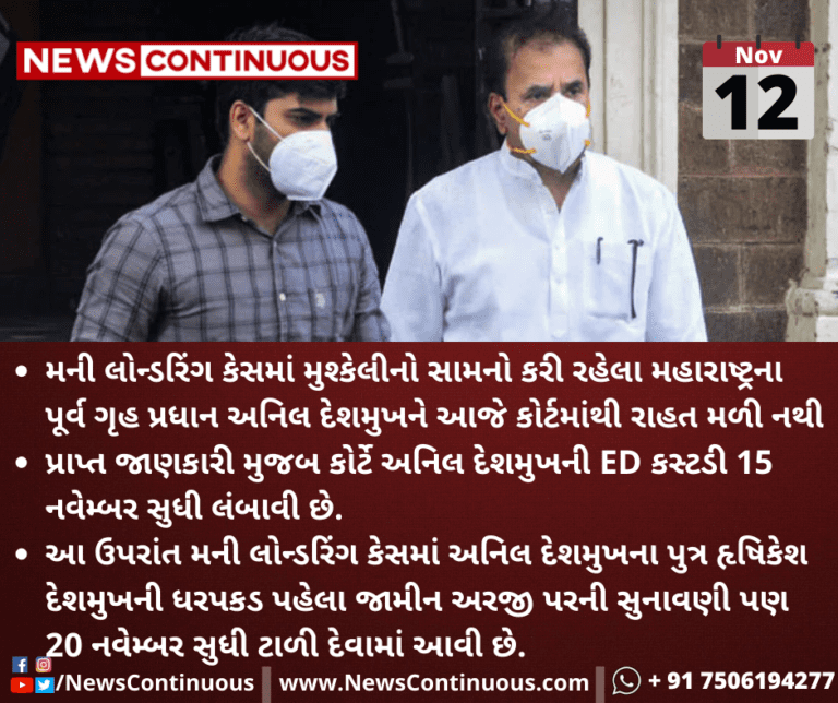 પ્રાપ્ત જાણકારી મુજબ કોર્ટે અનિલ દેશમુખની ED કસ્ટડી 15 નવેમ્બર સુધી લંબાવી છે.