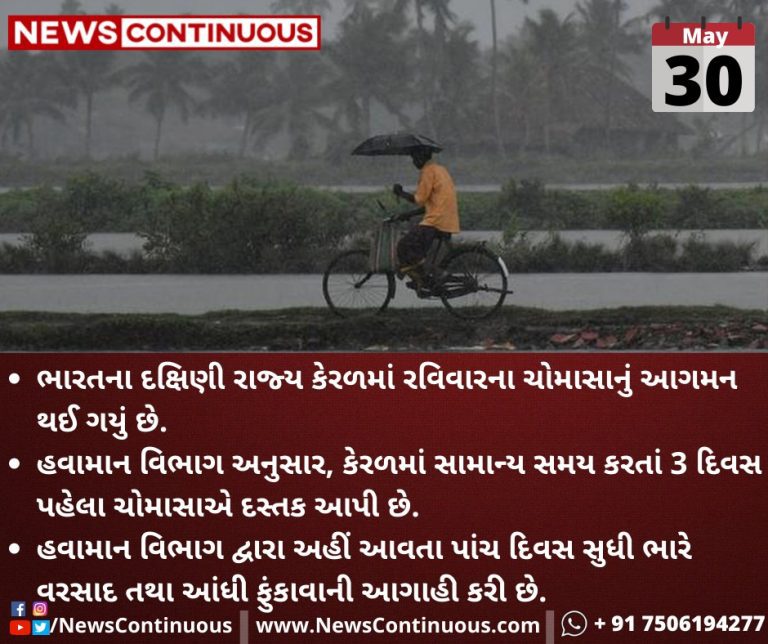 હવામાન વિભાગ(Meteorological Department) અનુસાર, કેરળમાં સામાન્ય સમય કરતાં 3 દિવસ પહેલા ચોમાસાએ દસ્તક આપી છે.
