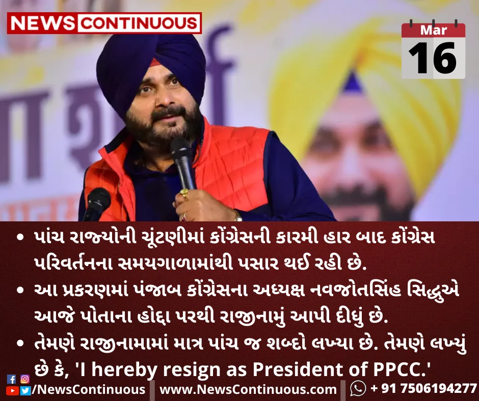 આ પ્રકરણમાં પંજાબ કોંગ્રેસના અધ્યક્ષ નવજોતસિંહ સિદ્ધુએ આજે પોતાના હોદ્દા પરથી રાજીનામું આપી દીધું છે.