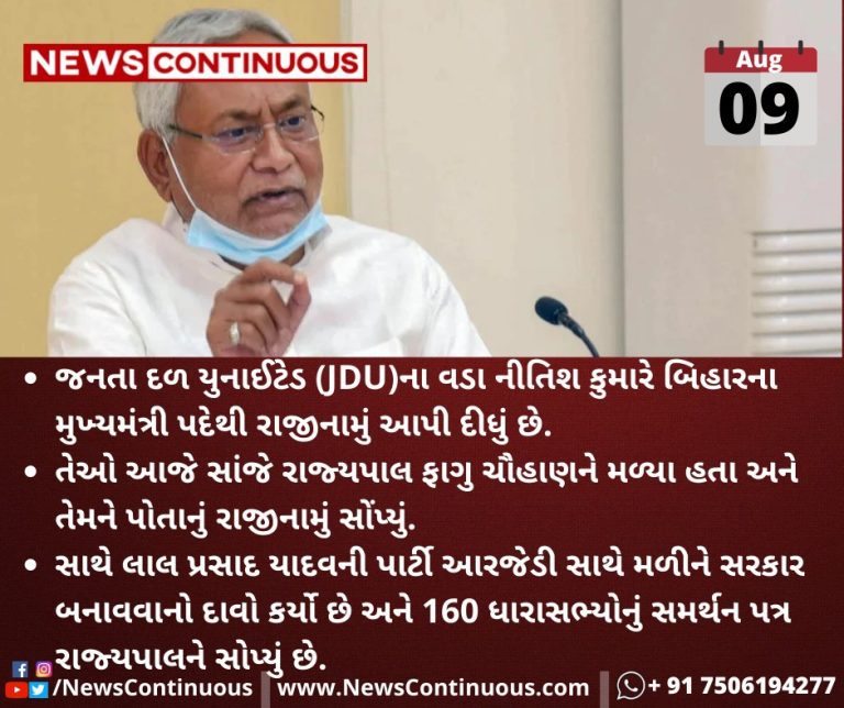 જનતા દળ યુનાઈટેડ (JDU)ના વડા નીતિશ કુમારે(Nitish Kumar) બિહાર(Bihar)ના મુખ્યમંત્રી(CM) પદેથી રાજીનામું(Resign) આપી દીધું છે.
