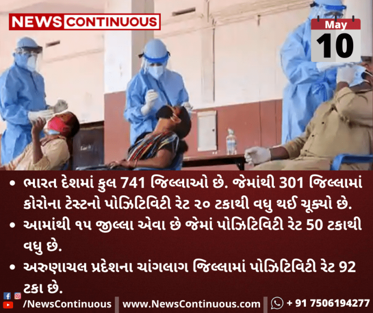 ભારત દેશમાં કુલ 741 જિલ્લાઓ છે. જેમાંથી 301 જિલ્લામાં કોરોના ટેસ્ટનો પોઝિટિવિટી રેટ ૨૦ ટકાથી વધુ થઈ ચૂક્યો છે.