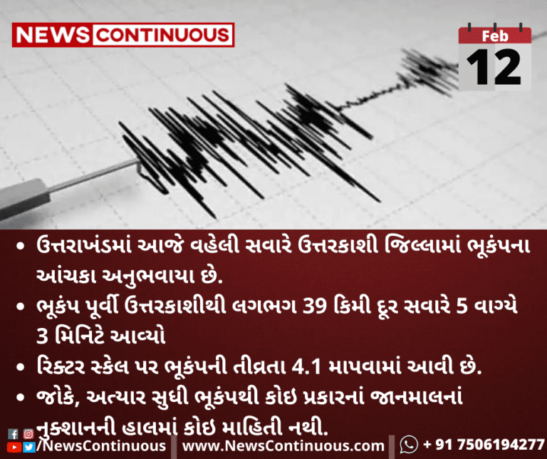 ઉત્તરાખંડમાં આજે વહેલી સવારે ઉત્તરકાશી જિલ્લામાં ભૂકંપના આંચકા અનુભવાયા છે.