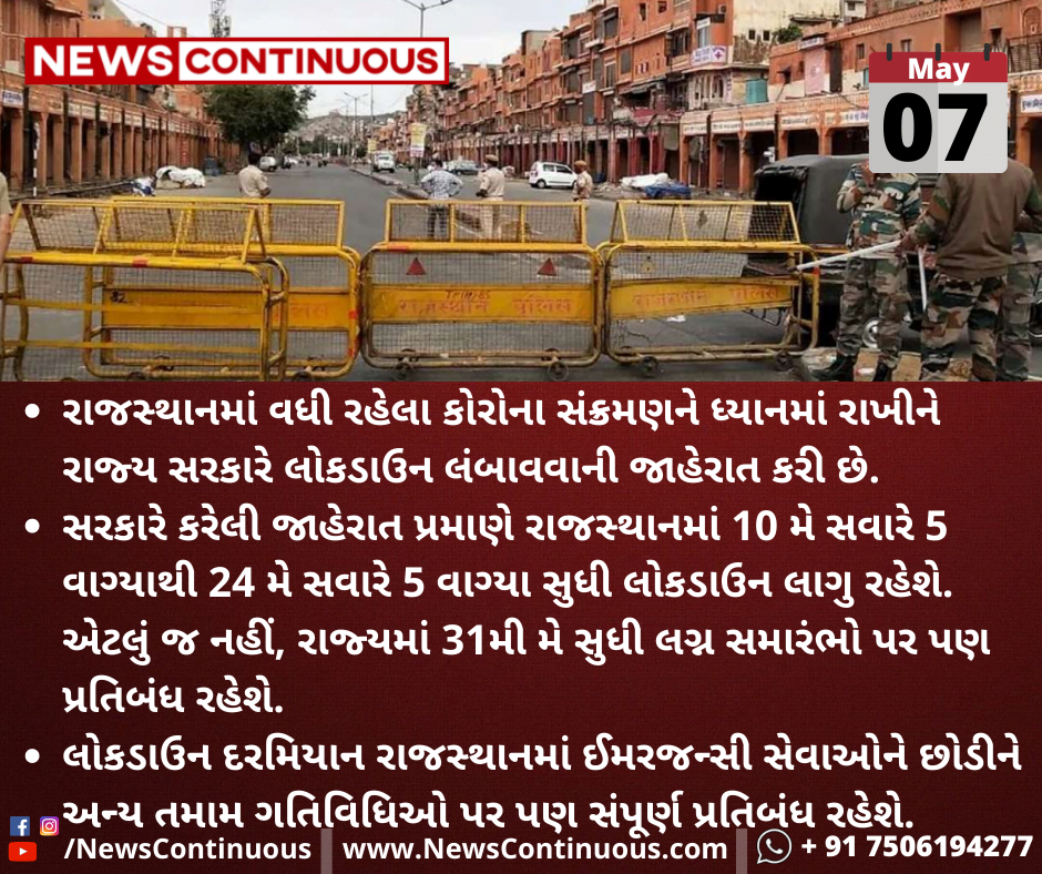 રાજસ્થાનમાં વધી રહેલા કોરોના સંક્રમણને ધ્યાનમાં રાખીને રાજસ્થાન સરકારે લોકડાઉન લંબાવવાની જાહેરાત કરી છે.