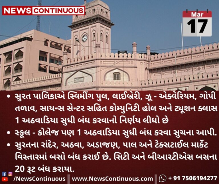 સુરત પાલિકાએ સ્વિમીંગ પુલ, લાઈબ્રેરી, ઝૂ – એક્વેરિયમ, ગોપી તળાવ, સાયન્સ સેન્ટર સહિત કોમ્યુનિટી હોલ અને ટ્યૂશન ક્લાસ 1 અઠવાડિયા સુધી બંધ કરવાનો નિર્ણય લીધો છે