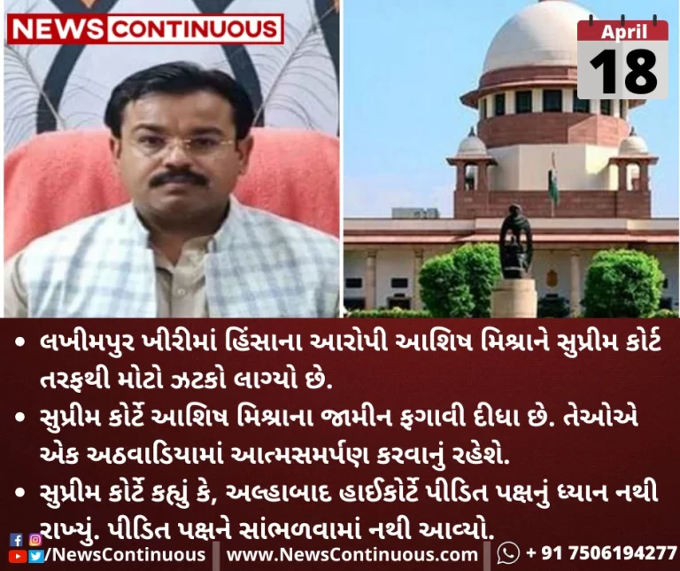સુપ્રીમ કોર્ટે આશિષ મિશ્રાના જામીન(Bail) ફગાવી દીધા છે. તેઓએ એક અઠવાડિયામાં આત્મસમર્પણ(Surrender) કરવાનું રહેશે.