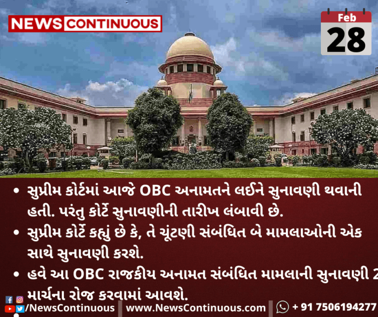 સુપ્રીમ કોર્ટમાં આજે OBC અનામતને લઈને સુનાવણી થવાની હતી. પરંતુ કોર્ટે સુનાવણીની તારીખ લંબાવી છે.