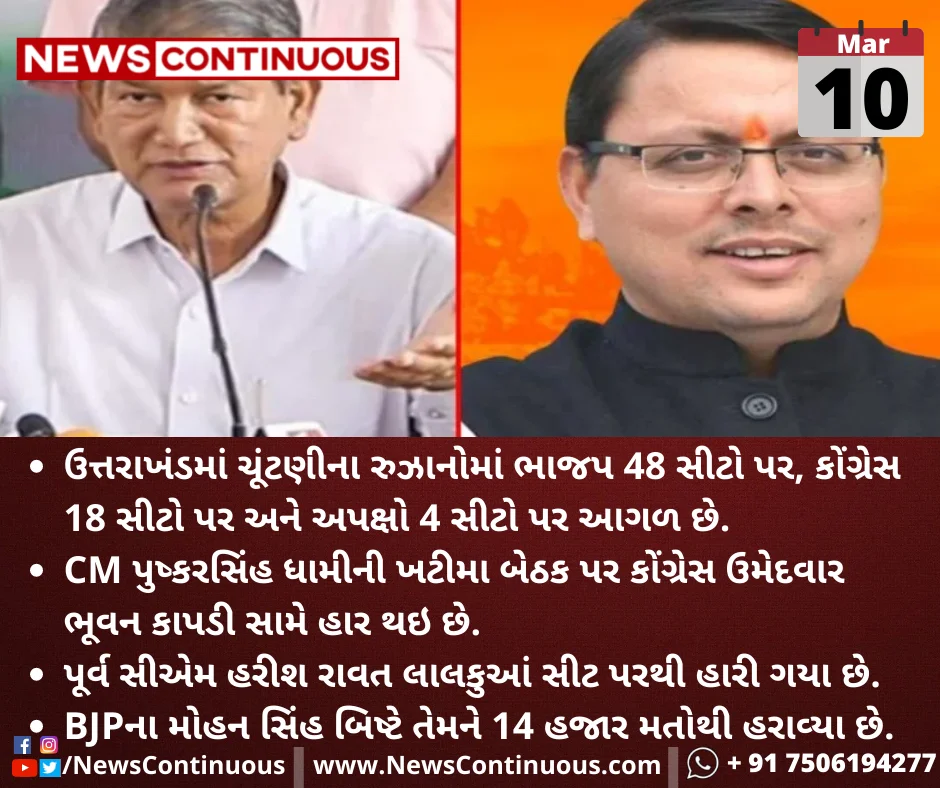 ઉત્તરાખંડમાં ચૂંટણીના રુઝાનોમાં ભાજપ 48 સીટો પર, કોંગ્રેસ 18 સીટો પર અને અપક્ષો 4 સીટો પર આગળ છે.