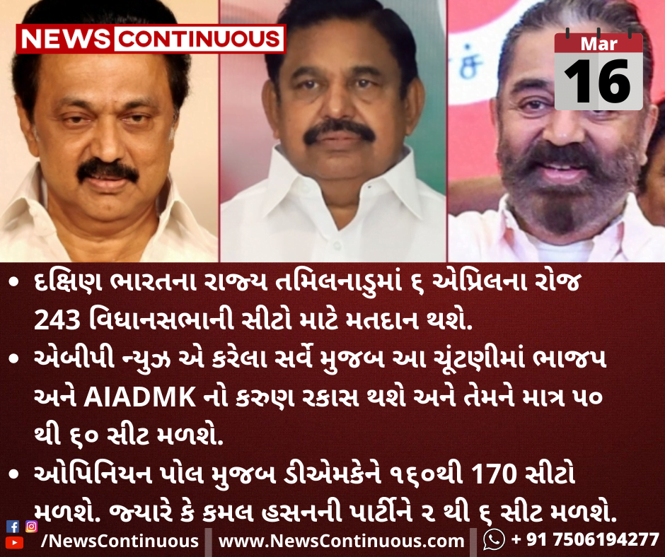 ઓપિનિયન પોલ મુજબ ડીએમકેને ૧૬૦થી 170 સીટો મળશે. જ્યારે કે કમલ હસનની પાર્ટીને ૨ થી ૬ સીટ મળશે.