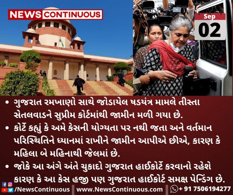 ગુજરાત રમખાણો સાથે જોડાયેલ ષડયંત્ર મામલે ધરપકડ થયેલ એક્ટિવિસ્ટ તીસ્તા સેતલવાડ(Teesta Setalvad)ને સુપ્રીમ કોર્ટ(Supreme court)માંથી જામીન મળી ગયા છે.