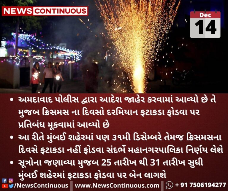 અમદાવાદ પોલીસ દ્વારા આદેશ જાહેર કરવામાં આવ્યો છે તે મુજબ ક્રિસમસ ના દિવસો દરમિયાન ફટાકડા ફોડવા પર પ્રતિબંધ મૂકવામાં આવ્યો છે