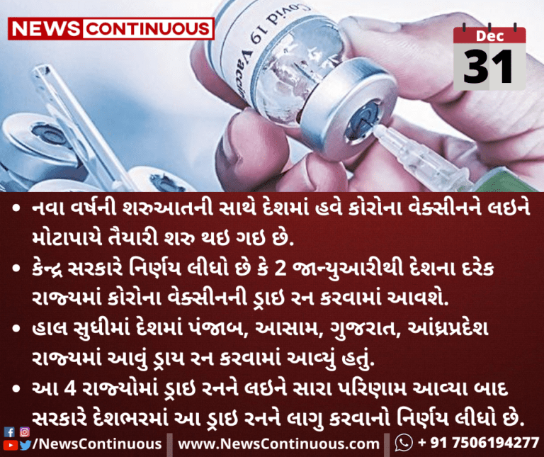 કેન્દ્ર સરકારે નિર્ણય લીધો છે કે 2 જાન્યુઆરીથી દેશના દરેક રાજ્યમાં કોરોના વેક્સીનની ડ્રાઇ રન કરવામાં આવશે.