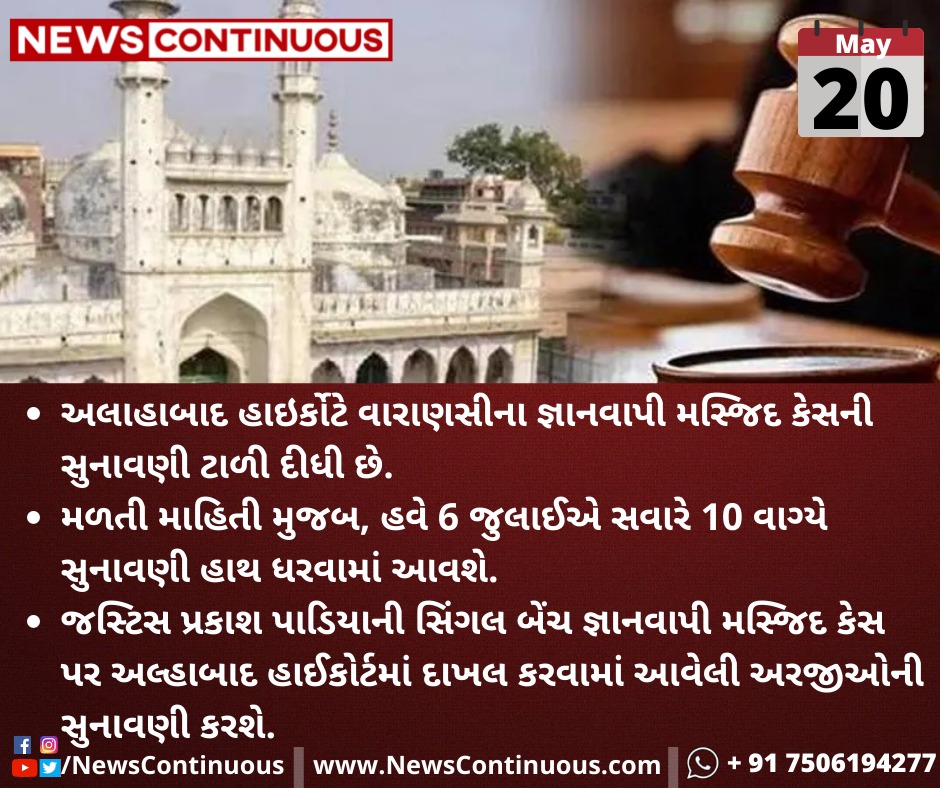 અલાહાબાદ હાઇર્કોટે(Allahabad High Court) વારાણસીના(Varanasi) જ્ઞાનવાપી મસ્જિદ(Gyanvapi Masjid) કેસની સુનાવણી ટાળી દીધી છે.