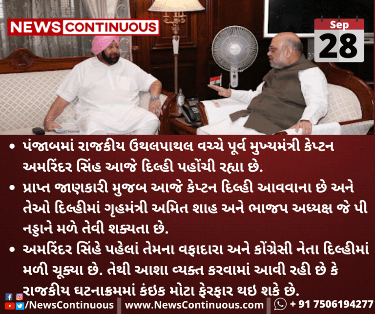 પ્રાપ્ત જાણકારી મુજબ આજે કેપ્ટન દિલ્હી આવવાના છે અને તેઓ દિલ્હીમાં ગૃહમંત્રી અમિત શાહ અને ભાજપ અધ્યક્ષ જે પી નડ્ડાને મળે તેવી શક્યતા છે.