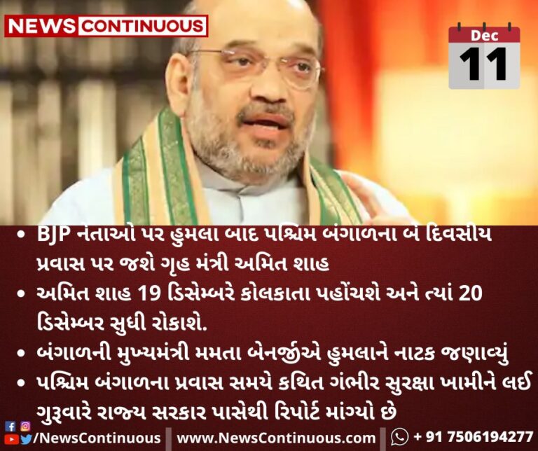- અમિત શાહ 19 ડિસેમ્બરે કોલકાતા પહોંચશે અને ત્યાં 20 ડિસેમ્બર સુધી રોકાશે.
