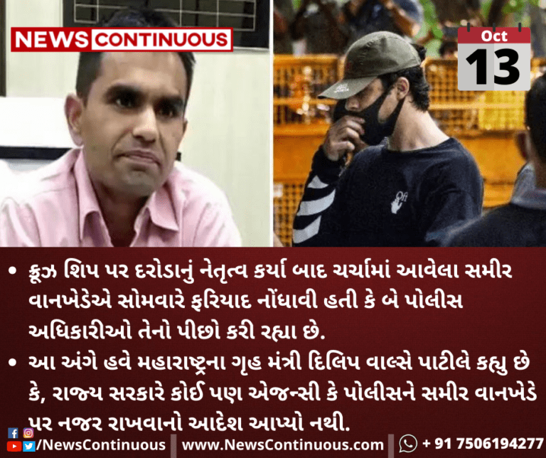 આ અંગે હવે મહારાષ્ટ્રના ગૃહ મંત્રી દિલિપ વાલ્સે પાટીલે કહ્યુ છે કે, રાજ્ય સરકારે કોઈ પણ એજન્સી કે પોલીસને સમીર વાનખેડે પર નજર રાખવાનો આદેશ આપ્યો નથી.